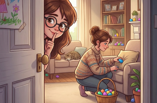 Then, she took the bag of flour and dipped three fingers in, then dabbed them on the floor, one after the other, more than the eggs, she made little bunny footprints to lead the way.