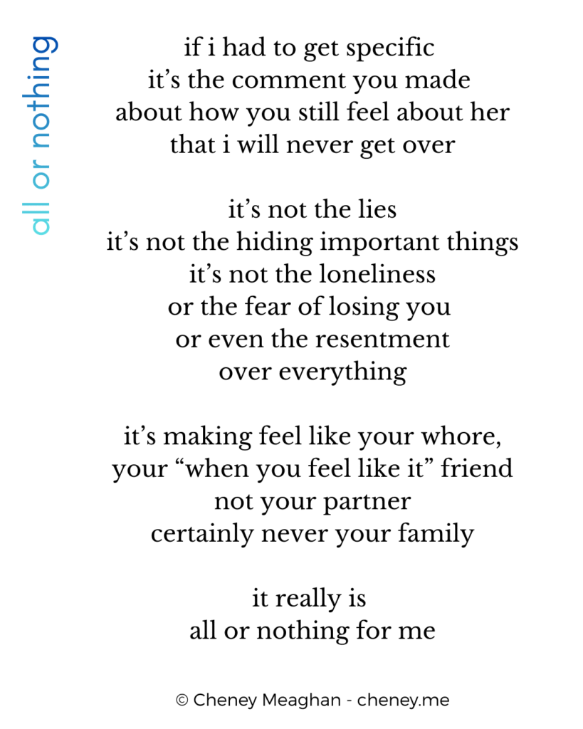 I swear to myself I’ll be picky in chasing the new love of my life, swear to myself that next time I won’t compromise on my needs. I’ve been doing somersaults to just get you to want me; it’s backbreaking work, and I’d like to be done now.